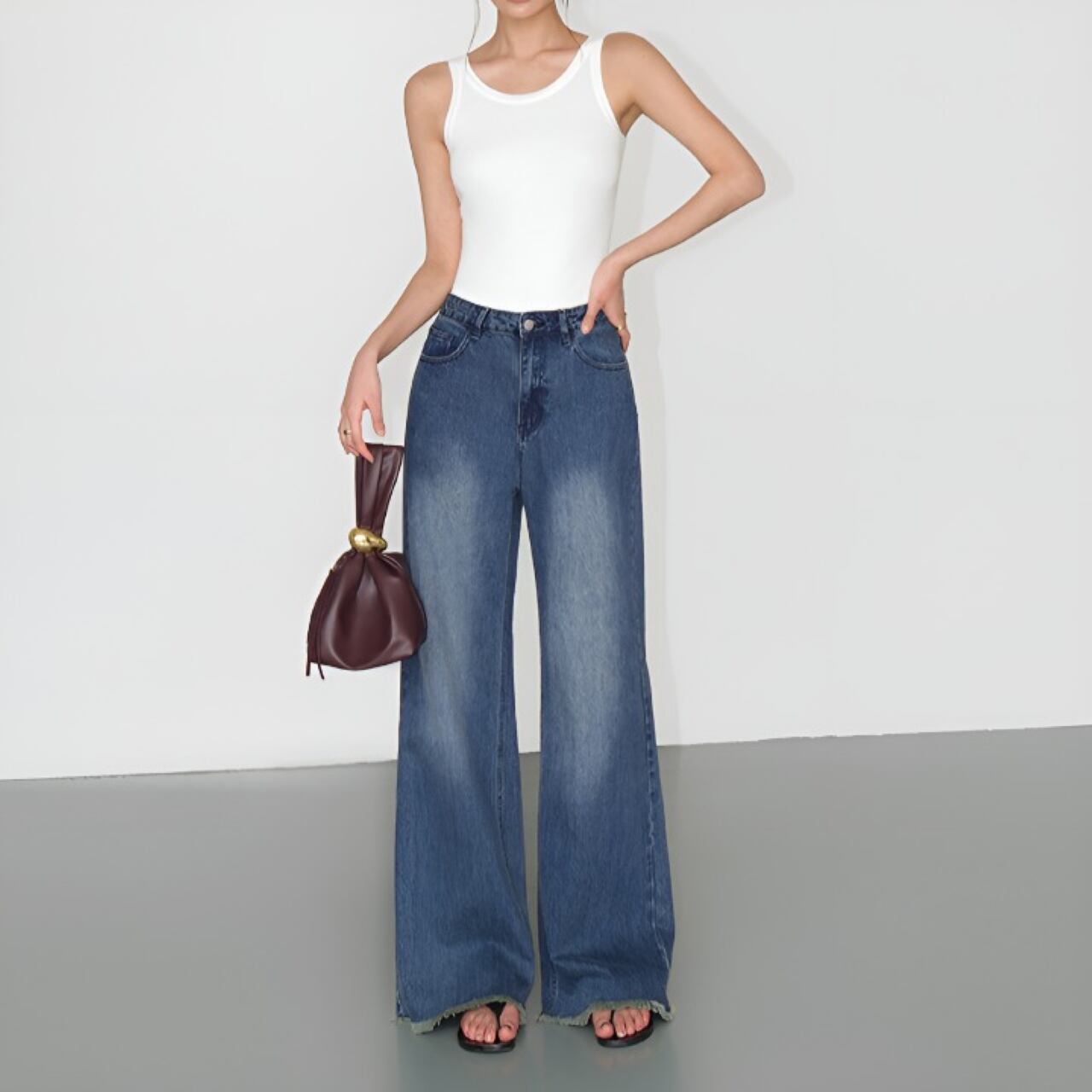 Dark blue loose wide leg jeans with raw edges【H00444】