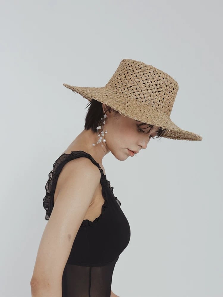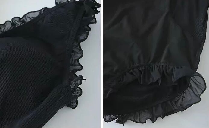 Vネックラインとフリルが特徴的なスイムウェア。デコルテを美しく演出し、女性らしい雰囲気を引き立てます。控えめなデザインながらも、洗練されたシルエットが魅力。