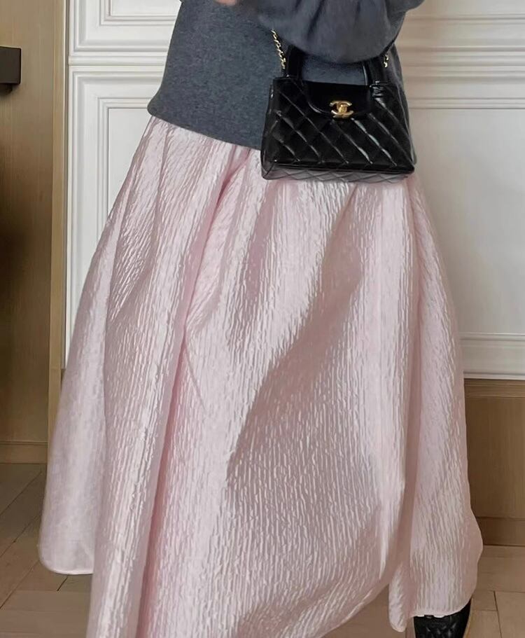 つぼみピンクスカートは、ふんわりとした女性らしいシルエットが魅力のアイテムです。