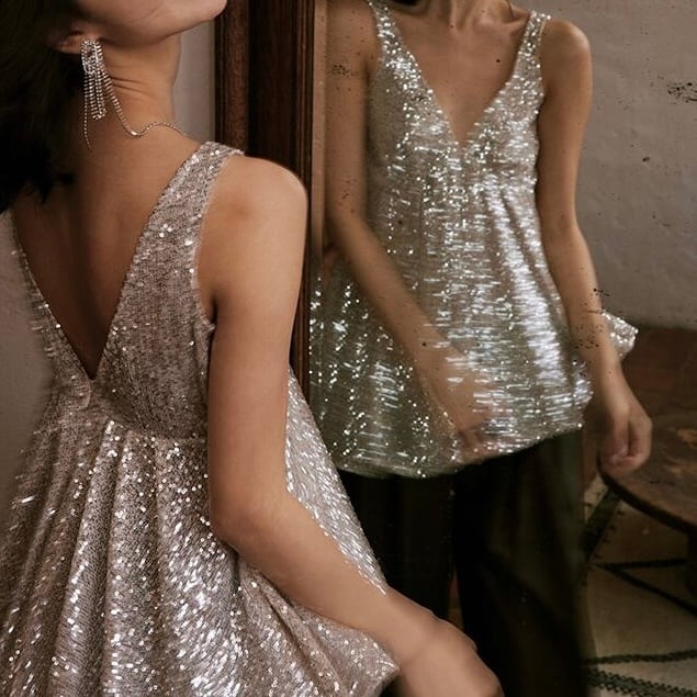 華やかなシルバーシーケンスが目を引くトップスです。パーティーやイベント、特別な日にピッタリのアイテムです。シンプルなデザインながらも、光沢感が上品でおしゃれな印象を与えます。