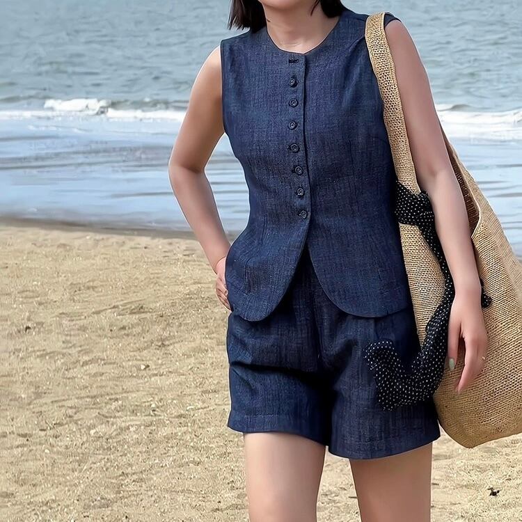 ヴィンテージブルーのデニムセットアップ。クラシックでスタイリッシュなデザイン。
