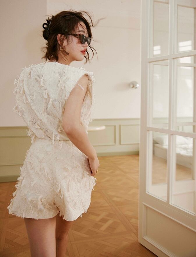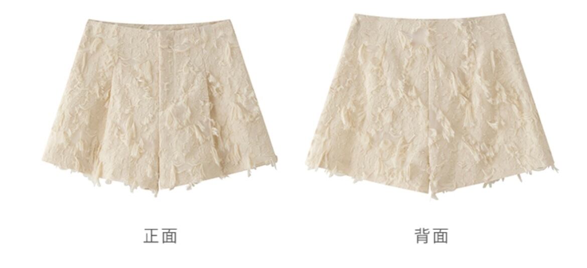 軽やかな印象を演出するアプリコットカラーと繊細なフェザープリントが特徴のパンツです。