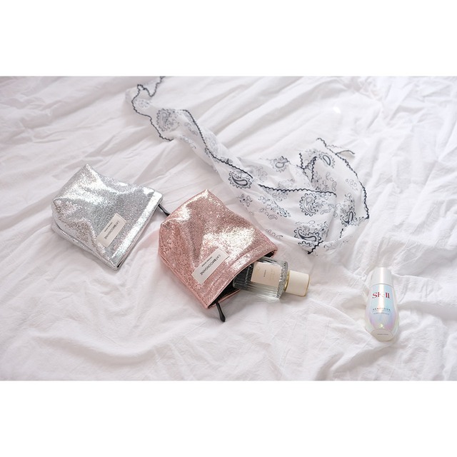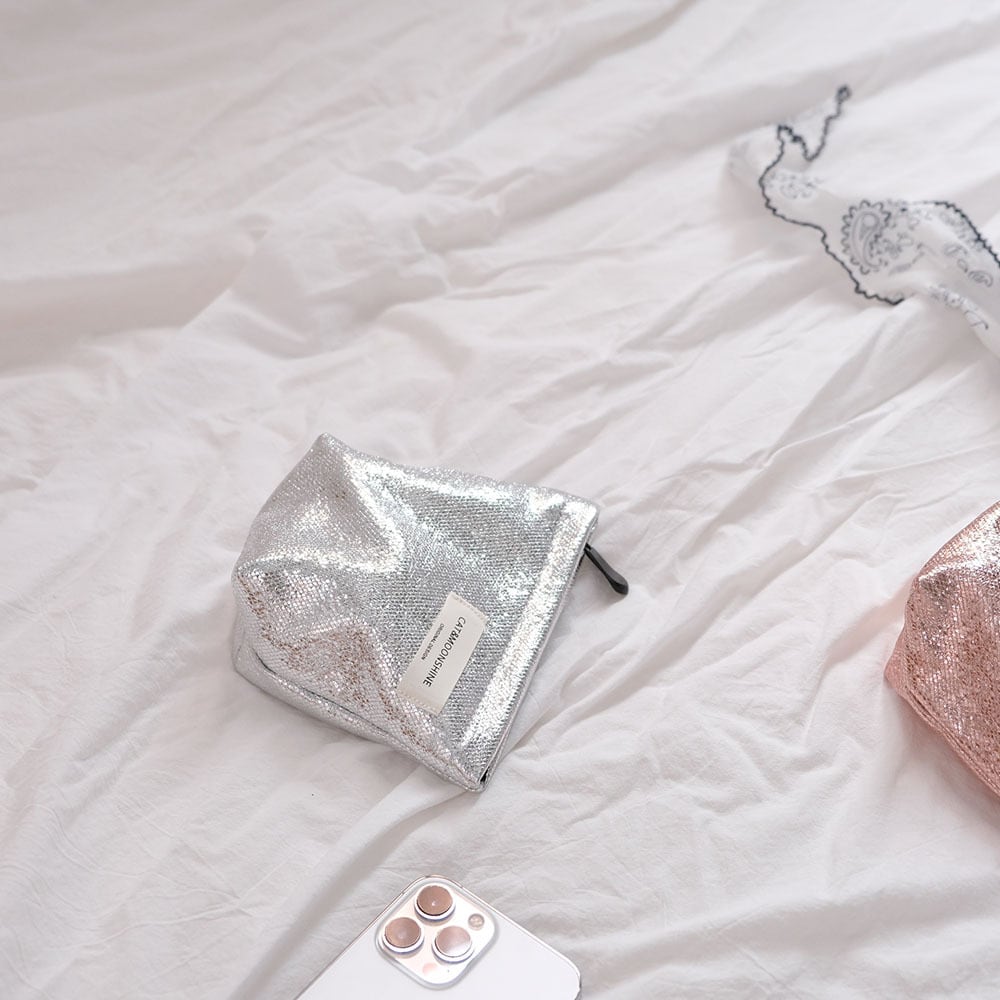 シンプルかつ華やかなデザインが特徴のアイテムです。小さなサイズながらも、キラキラ輝く素材が光を反射し、存在感を放ちます。使い勝手の良いポーチは、コスメや小物を収納するのにぴったり。