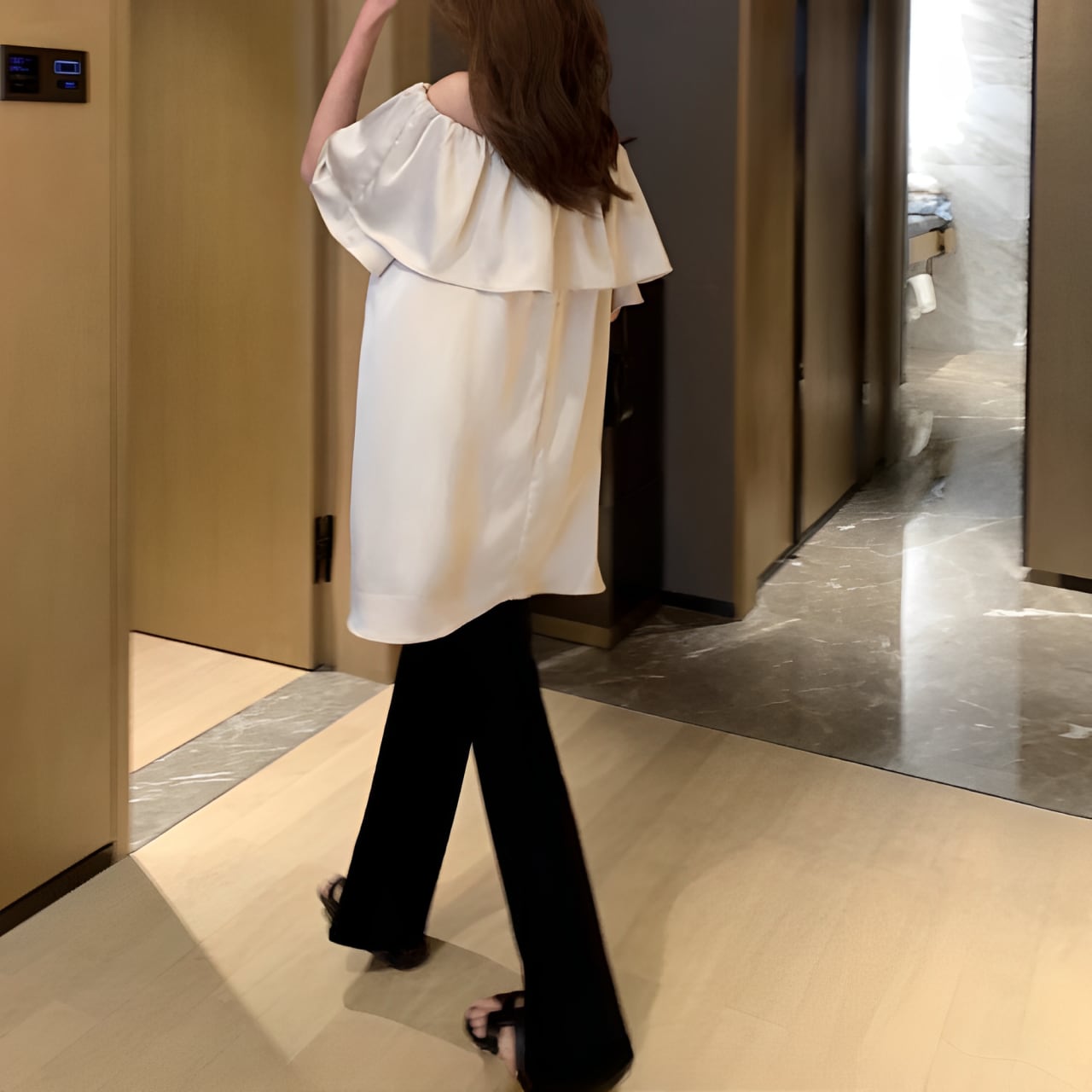 シンプルでありながらエレガントなデザインが特徴のシャツです。サテン素材を使用しているので、上品な光沢感があり、着心地も快適です。