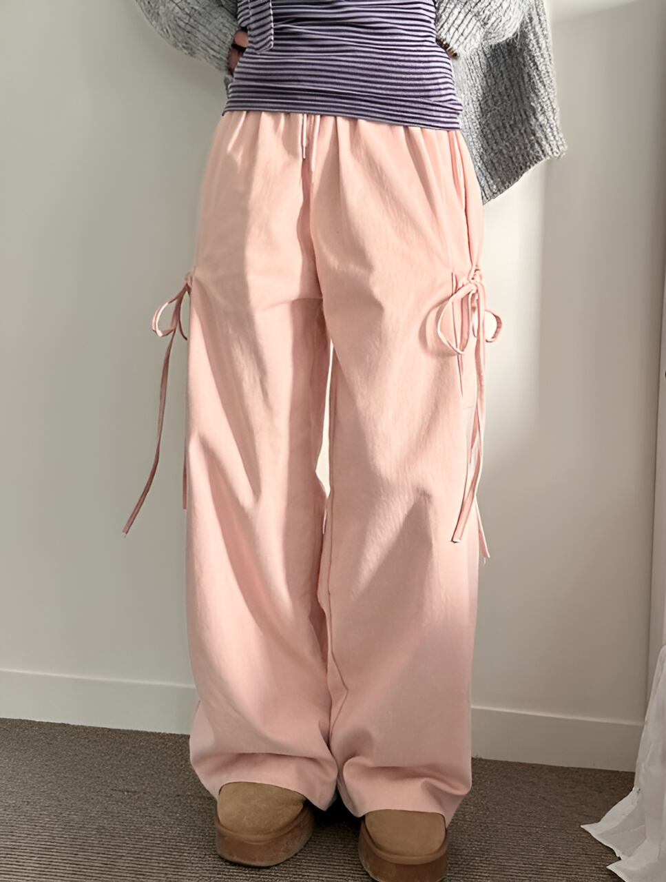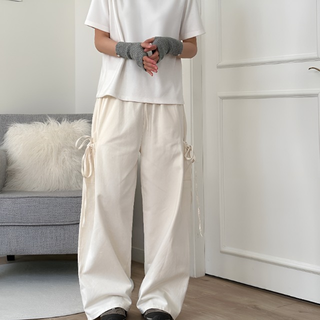 リラックス感たっぷりのストレートなシルエットで、軽やかな履き心地です。ウエストには可愛らしいリボンが飾られ、女性らしいポイントを演出したパンツです。